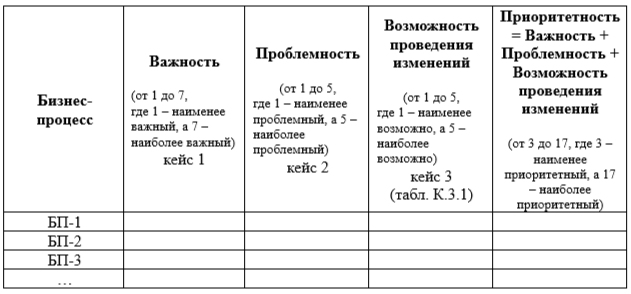 бизнес-процессы для оптимизации (табл. К.3.1, К.3.2.).