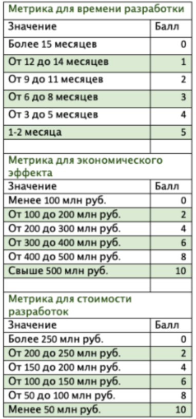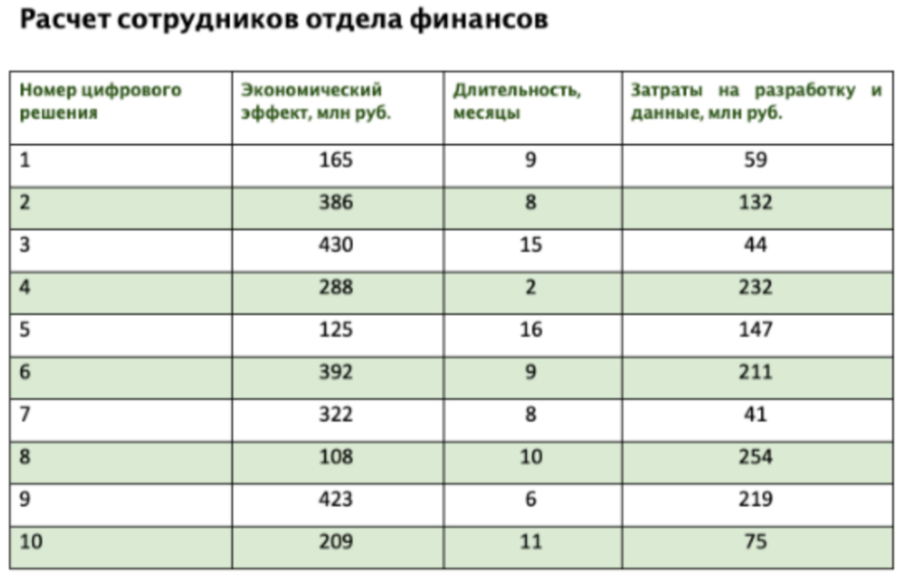 Сотрудники отдела финансов уже рассчитали затраты на внедрение каждого из решений (в том числе на сбор данных для реализации), определили длительность внедрения и экономический эффект.