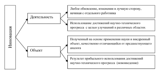 В настоящее время существует некая двойственность в определении термина “инновация” (рис. 2.1): инновацию понимают и как деятельность, связанную с возникновением и применением нового явления, и как результат этой деятельности — сам новый объект (явление).