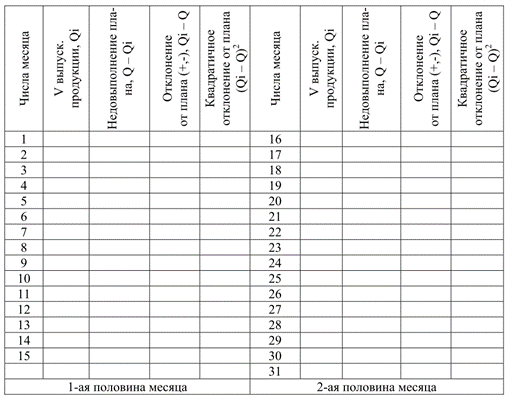 При решении задач для определения коэффициента ритмичности, колеблемости производства и неравномерности работы нужно составить вспомогательную таблицу.